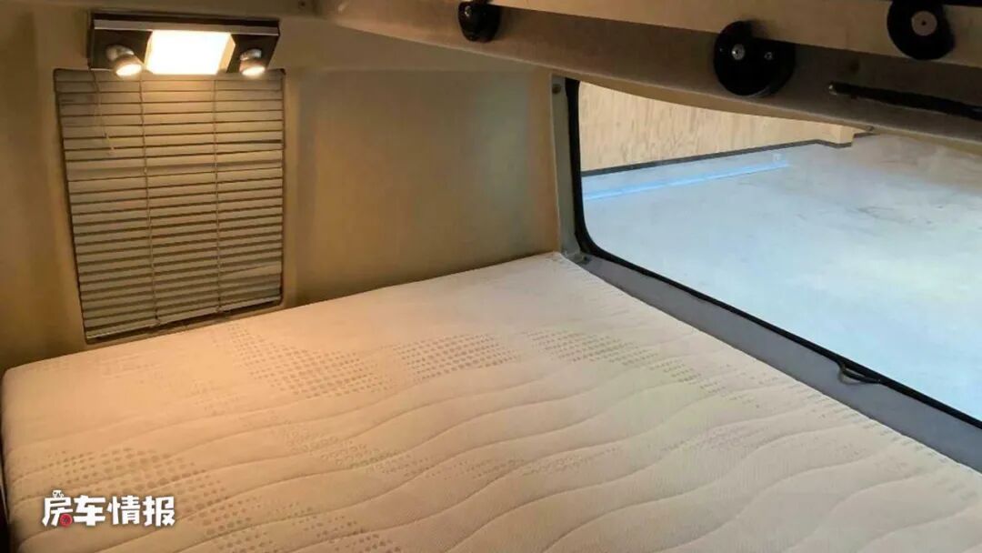 车尾部的横置双人床搭配暖色的氛围灯看起来非常的温馨,另外在侧面的壁板上还带有非常有年代感的百叶窗,放在今天来看也是别有一番风味。