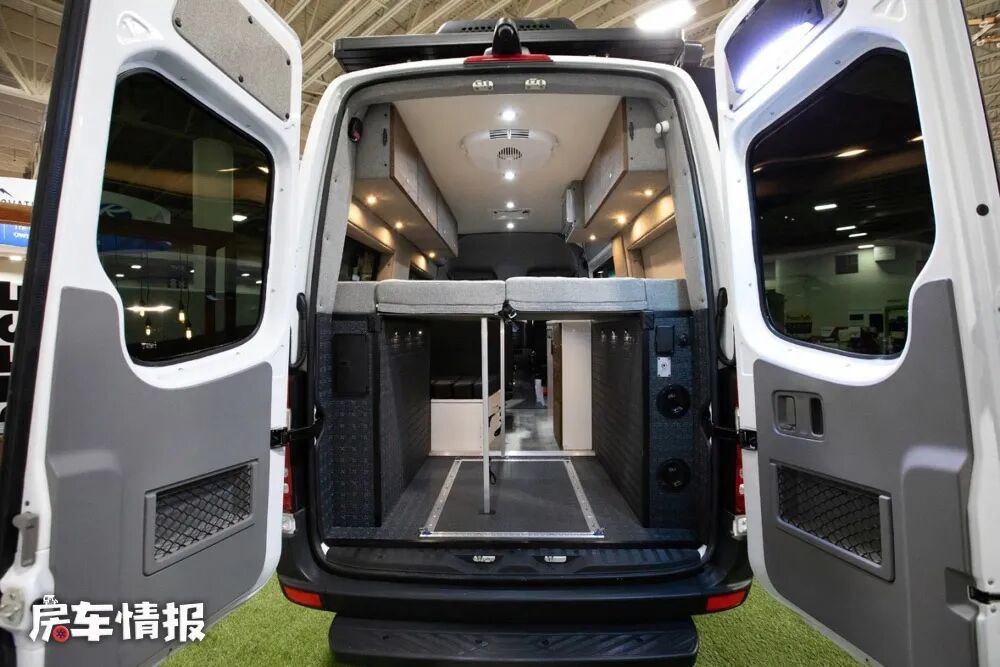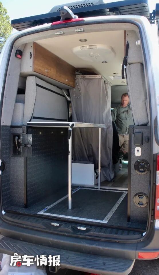 整车采用了一个右侧上门的方式,车内的布局其实和我们现在房车内部的布局比较类似,都是运用了功能性的分区布局,而且整体的规划也非常适合两个人使用。