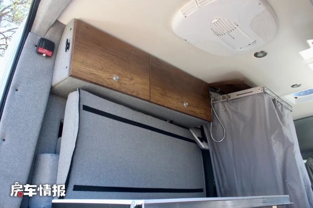最大的亮点也是这排双人沙发,它还可以向前移动,变成一个长凳,结合顶部的防水拉帘,另外还有隐藏在顶部储物吊柜中的淋雨设施,从而打造形成一个简易的卫浴区,也可以解决洗漱和上厕所的需求。