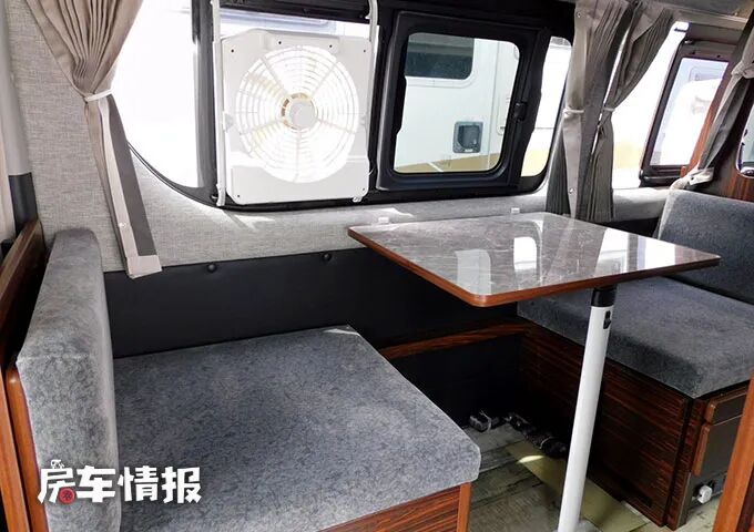 乘客门后方是一个大型的储物柜,平时可以用来挂放衣物或者放鞋子。对面则是四人对卡座式的会客区,虽然座椅沙发不是高档的皮艺可调节的沙发,但是整体的空间还是比较宽敞的,就是椅背比较直挺,坐久了会累,沙发中间提供了一张可移动的餐桌,除了在车内使用,天气好的时候也能作为户外餐桌配合户外椅使用。