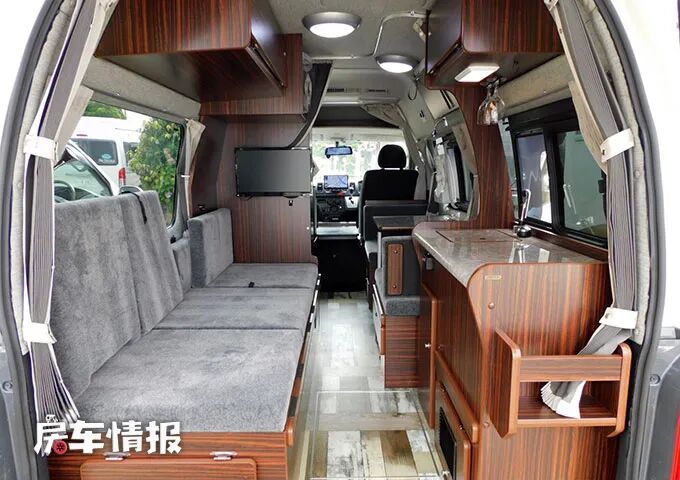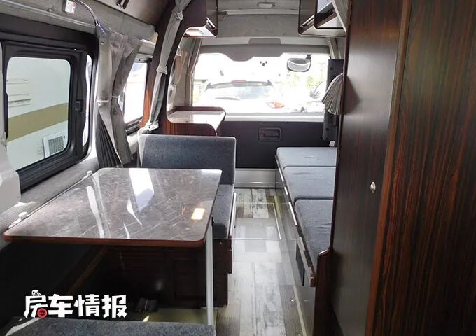 虽然这款房车的外宽还不足一米七,但是从车厢左侧进入车厢内部,可以看到车内的整体布局设计还是比较规整的,分区也比较明确。