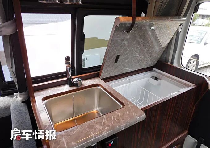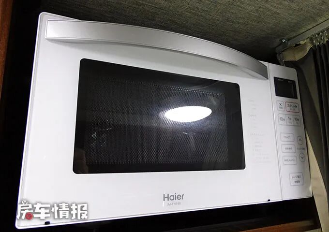 会客区后方是全车的厨房操作台,台面的尺寸中规中矩,提供了带盖的不锈钢水盆以及一台40L的翻盖车载冰箱,同时也配备了一台卡式炉,使用起来更加的灵活,也能满足出行的做饭需求。另外,在上方还看到了我们的国货之光海尔的微波炉,可真亲切呀~