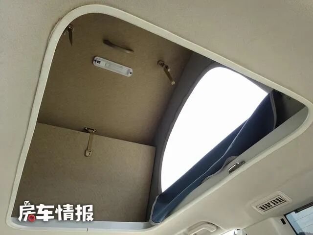 除去这张沙发床,将车顶部的升顶打开,就可以看见上方的床铺了,升顶内的空间也还可以,两边带有布艺的窗户,可以保证此区域的采光和通风,而且上方升顶区域内的床铺相对更平整一些,睡起来也更舒适一些。