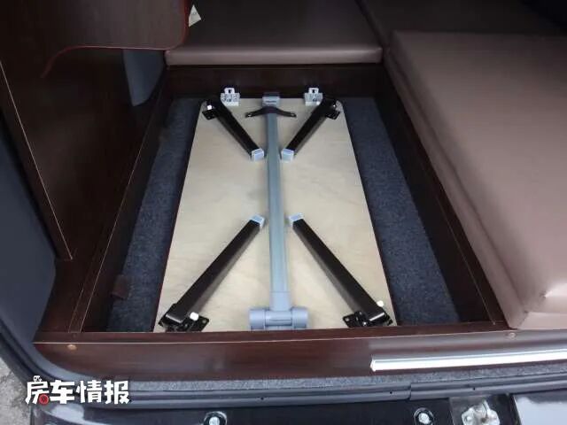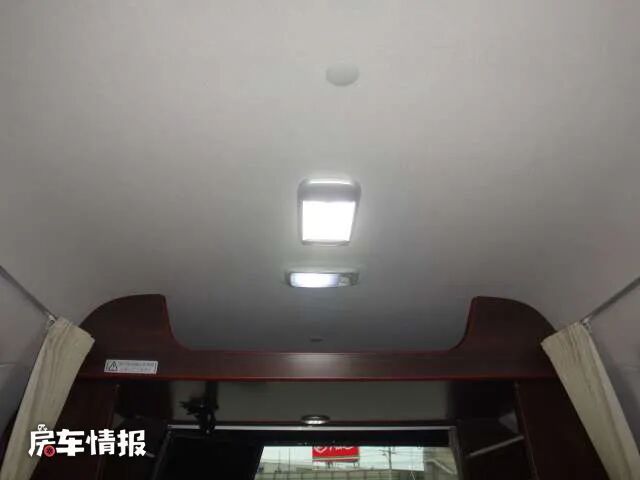 全车的顶部都配备了照明灯,可以保证车内的光亮度,另外车厢尾部上方还设计了一个二层式的储物平台,可以放被子或其他家用品,因为车高不高,所以拿取也比较方便。
