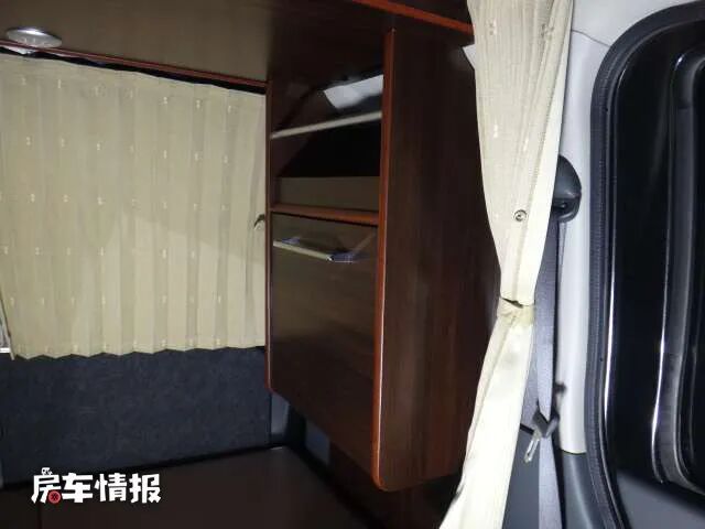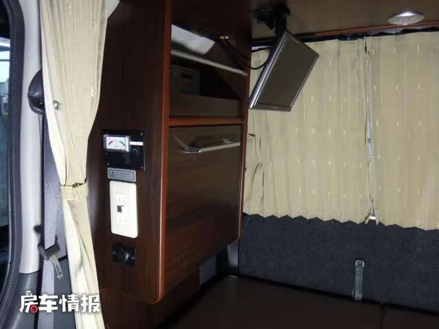 车厢尾部平时可以作为储物空间使用,两侧则分别带有储物吊柜,一边是全车的电路系统,另外一边则可以放一些日常的用品,但是空间并不是很充足。