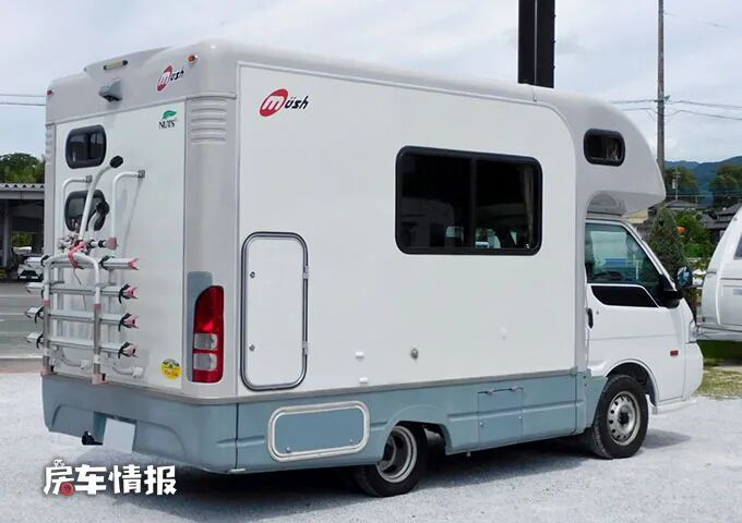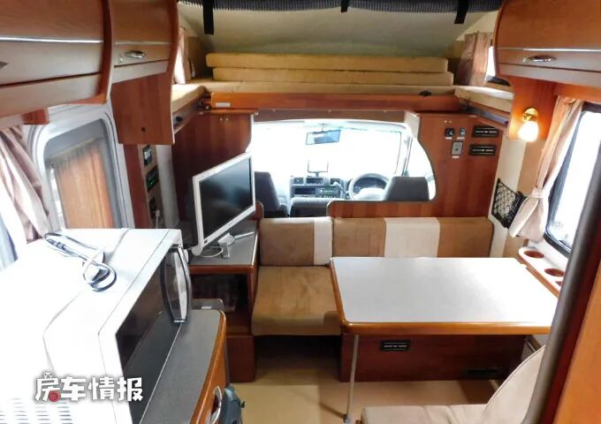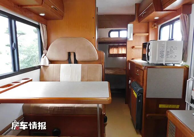 这是一辆基于日产Vanette卡车底盘所打造的C型房车,虽然整体也是采用了大额头式的造型,但是在尺寸上还是相对比较小巧的,长宽高分别为4880*2070*2680mm,长度不足5米,可想而知内部的空间也非常有限,不过不到2米7的车身高度在通过性上还是表现的不错。