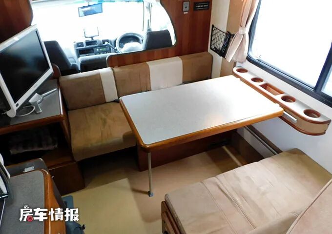 乘客门相对的会客区采用了五人对卡座+餐桌的设计方式,平时整车在行驶过程中最多可以坐7个人。