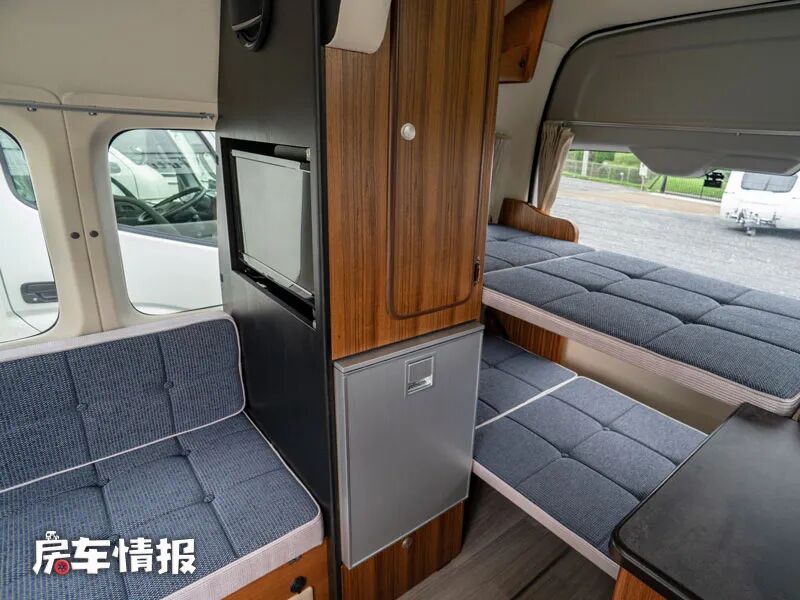 会客区与车尾部的休息区中间是一个多功能的区域,一侧带有49L的车载冰箱,以及一个带有挂衣杆的夹缝衣柜,同时侧面壁板上还配置了一台液晶电视,可以满足平时的基本生活需求。