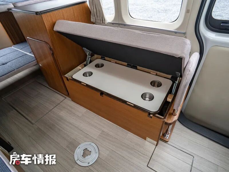 驾驶室后方还是一个基本的乘客座椅,这排座椅可向前或向后旋转,平时行车时面向前方可以缓解长途跋涉带来的不适感,而当驻车时,就可以面向后方,发挥更多的作用。