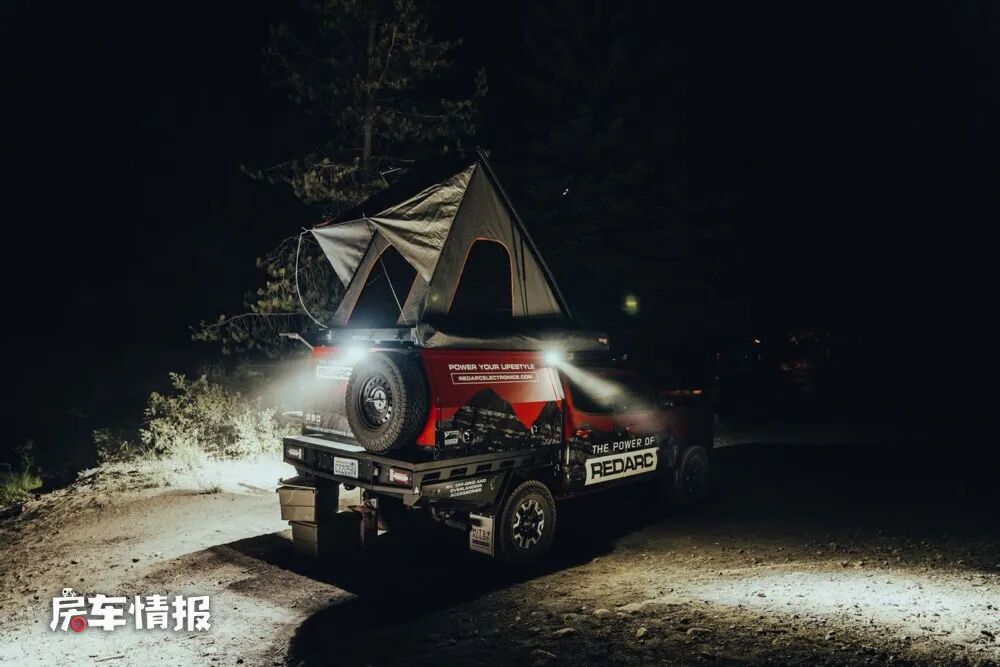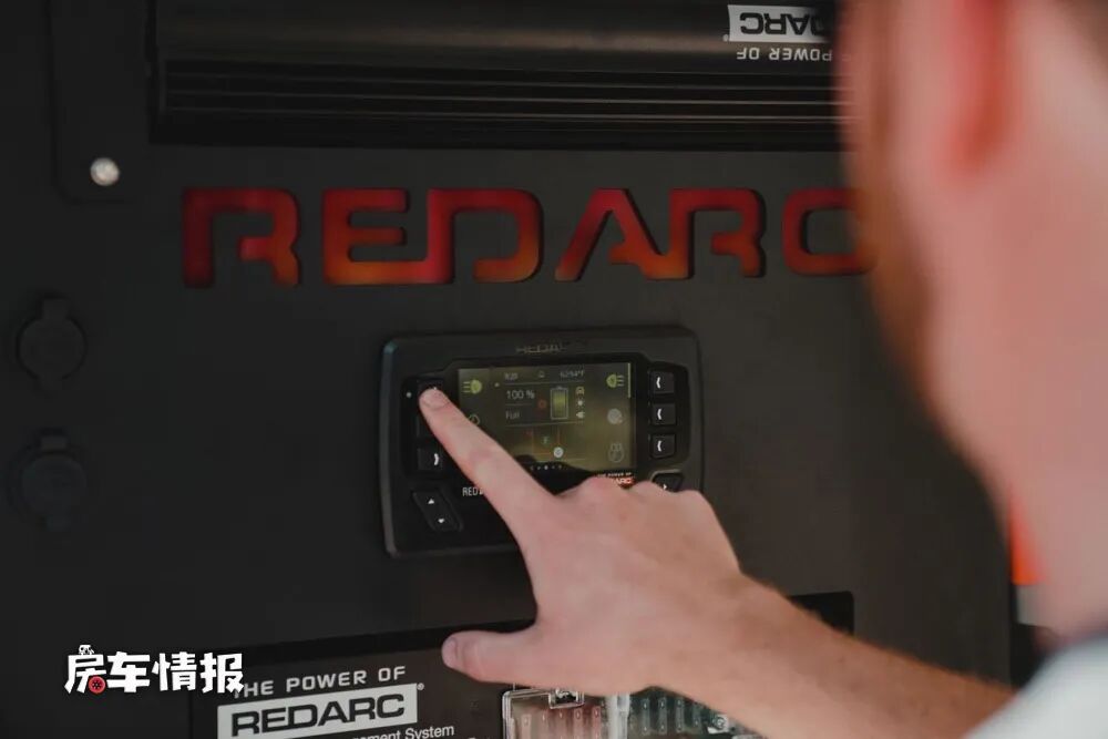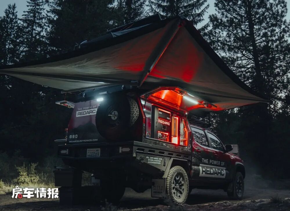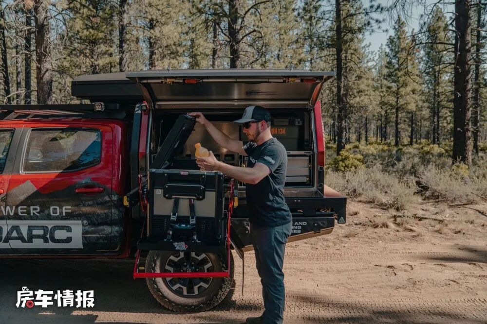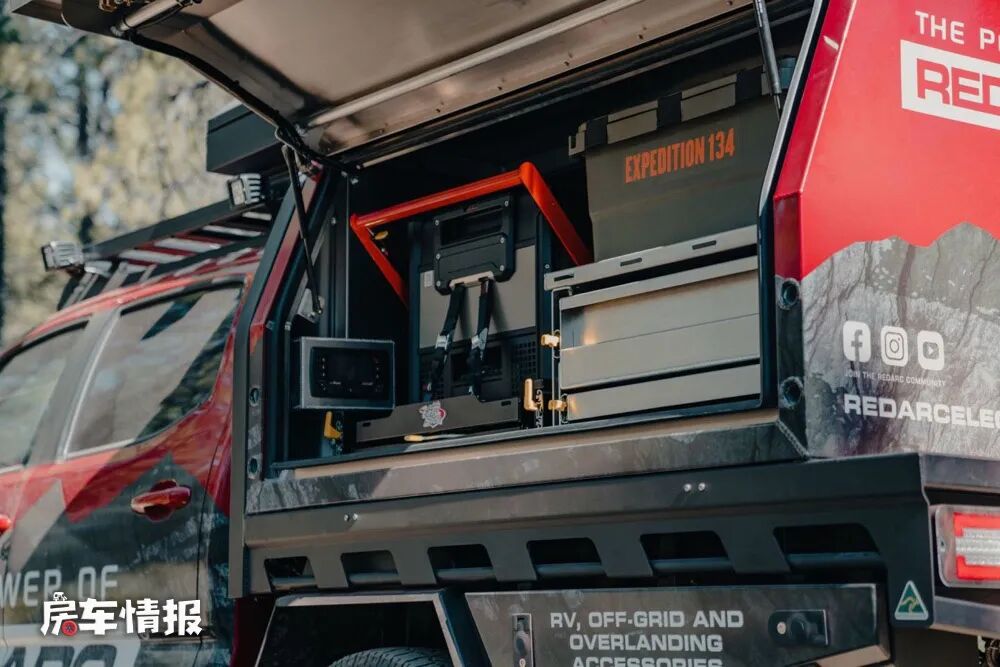 说回这辆带有生活功能的露营车,全车在后方加入了一个多功能的箱体,内部带有可满足出行生活需求的用具,包括一台滑出式的ARB Zero冰箱、一台ARB空气压缩机以及内外部的照明供电系统,另外还带有两台Redarc RedVision 彩色显示屏,可以控制车内的配件、观察电池信息和水位情况,也是非常的科技和智能了。