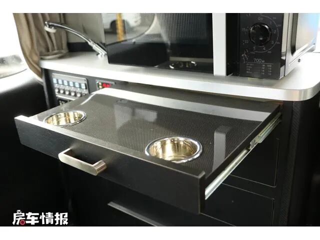 操作台的台面上不仅提供了抽拉式的水龙头和微波炉,下方抽出第一层抽屉可以看到隐藏在内部的带有杯托的小桌板,而下方则是多个储物抽屉,并且每个抽屉中都带有分隔区域,可以更加合理的存放物品,另外全车还提供了一个14L的车载小冰箱。