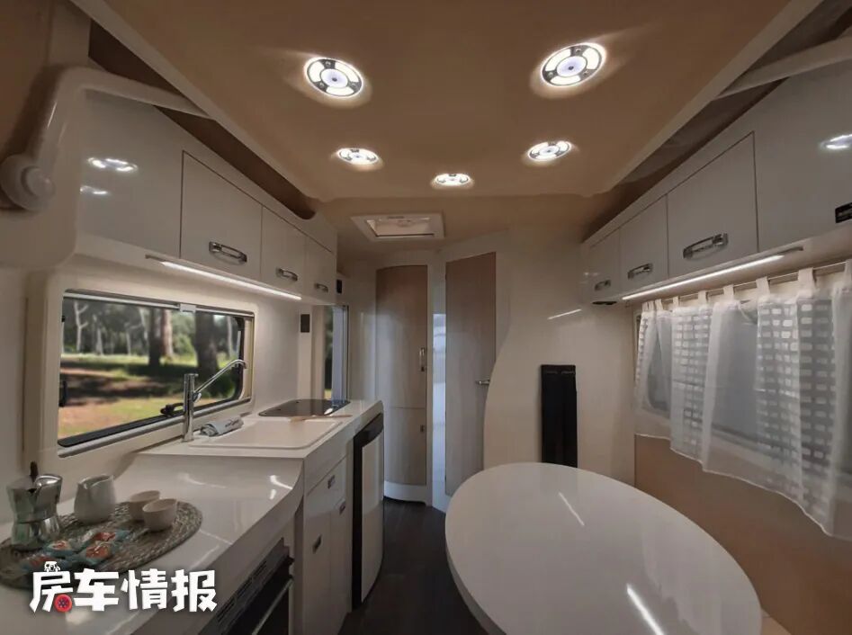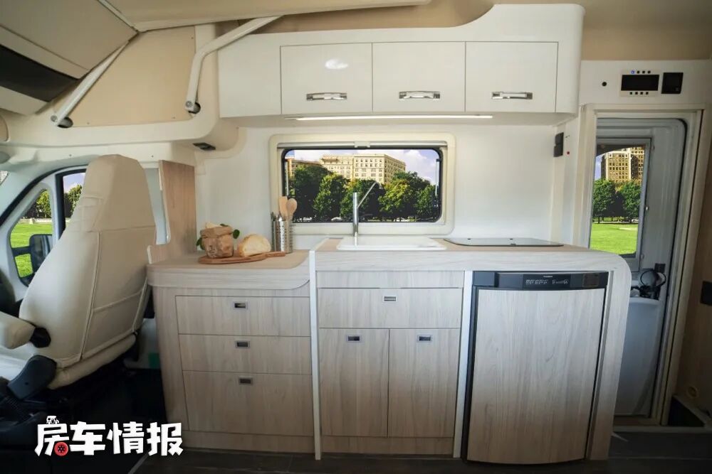 在会客区的对面则是全车的厨房区,提供了长条的厨房操作台,台面上带有洗菜池、燃气灶和备菜区,下方还嵌入了一台车载冰箱,同时还提供了多个储物空间。