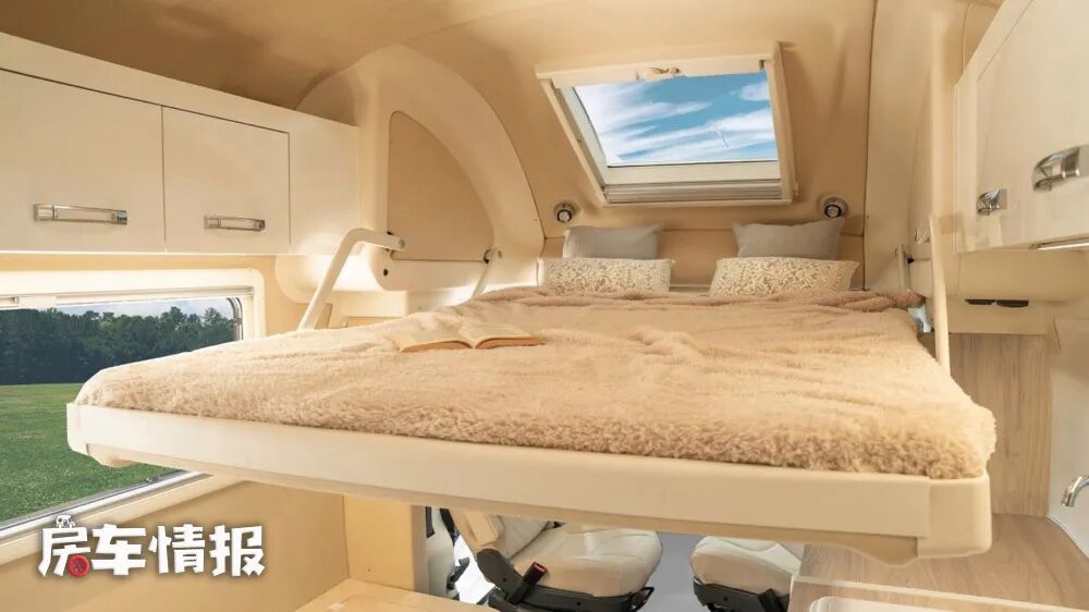在车厢前部的上方,还隐藏了一张升降双人床,尺寸为1980*1350mm,完全可以容纳两个成年人使用,顶部还带有一扇大尺寸的天窗,可以为休息区提供不错的采光。下方的L型沙发晚上也可以变成一张尺寸为1880*710mm的单人沙发床,所以整辆车最多可以满足三个人的睡眠需求。
