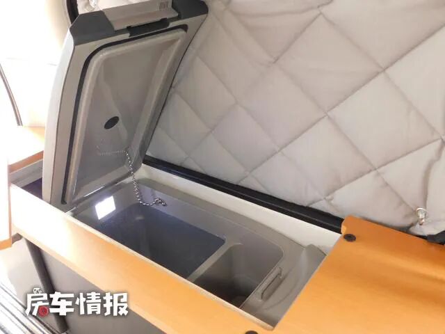 除此之外,车厢尾部带有一圈U型的桌板设计,其中一侧隐藏了一台18L的车载冰箱,也可以存放一些简单的冷饮,拿取也比较方便。