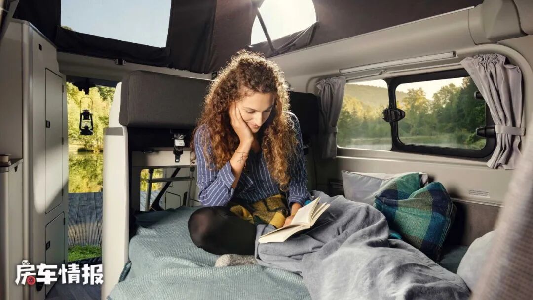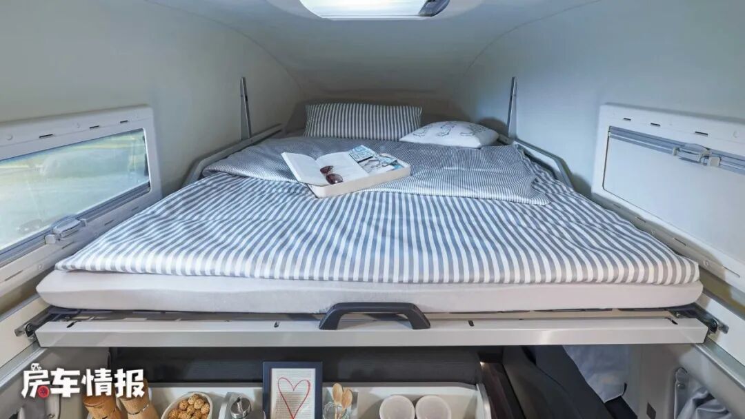 当夜晚需要休息的时候车顶可以抽出一张大双人床供使用,这个位置可以说私密性还是不错的,而且三面环窗,可以保证通透性。