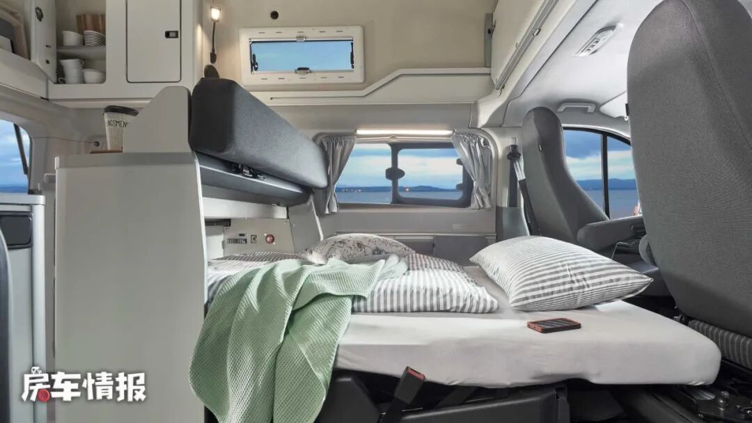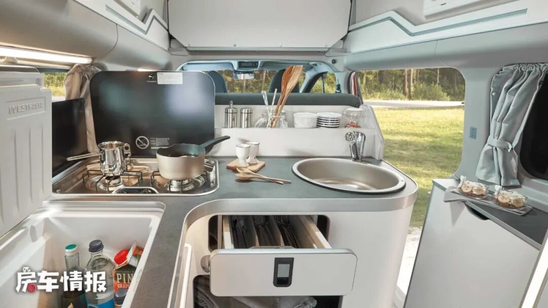 当累了以后就可以躺在车内休息,上下都有床铺,4口人出去玩空间妥妥的没有任何问题。另一侧是厨房操作台和储物空间,除了没有固定式的卫生间,其它生活设施可以说是一应俱全的。