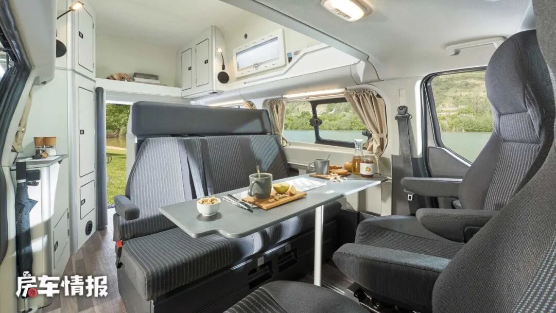 进入车内,内部总共可以核载5人,会客区双人座椅均可以向后旋转,中间餐桌是可拆卸的形式,形成了一个五人会餐区。