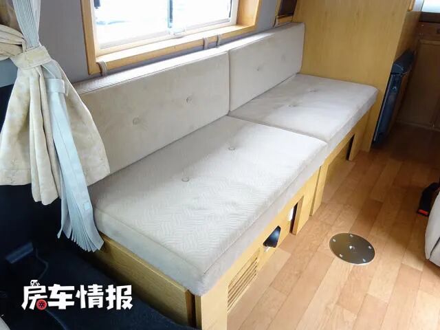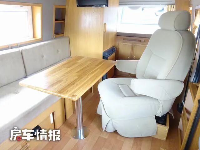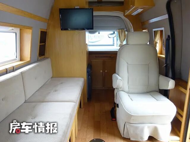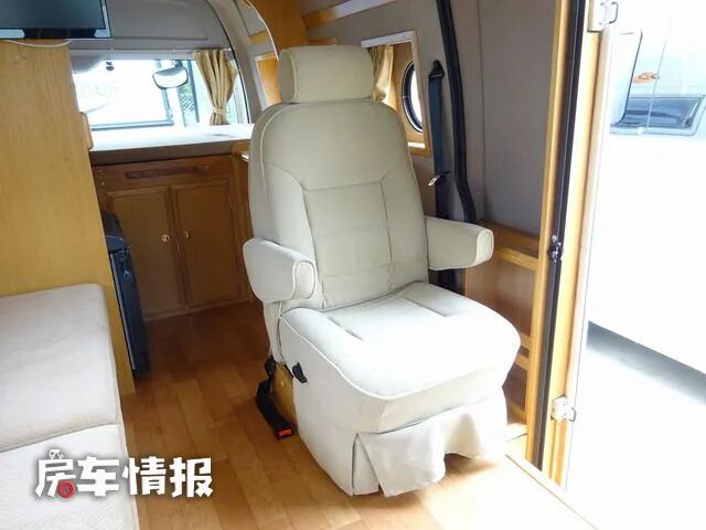 主驾驶座椅后方是一长排的沙发,相比普通的乘客座椅,舒适性略差,不过这辆车还有一个比较特别的配置,就是在临近乘客门的地方放置了一张类似老板椅的单人沙发,不仅带有头枕和扶手,还能够旋转,并且舒适度和柔软度相较于长条沙发还是比较不错的。