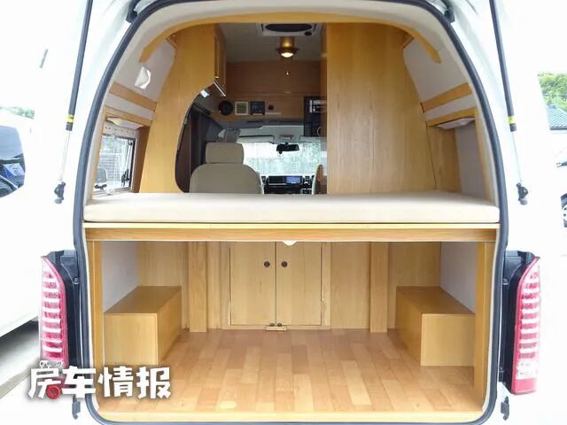 打开后尾门可以看到床板下方的超大储物空间,足够平时存放一些大型的行李,而且车内也配置了小型的柜门,可以在车内就拿取行李,整体来说还是比较人性化的设计。