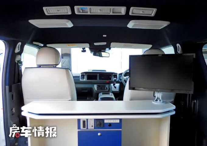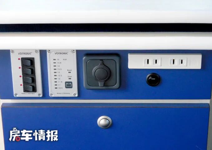 主副驾驶座椅后方提供了一张长条桌,和我们平时常见的升降餐桌不太一样,这张长条桌更像是一张办公桌,中间带有全车的电路控制面板,下方则是储物抽屉。平时要是有办公需求,两个人坐在乘客座椅上一人一台电脑,连接上电源就可以实现啦。