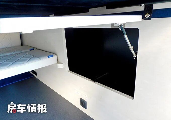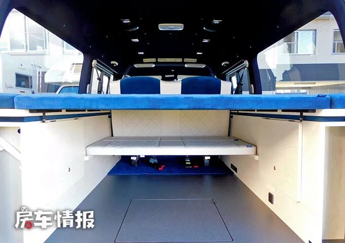 下方还有一个横置的小床板,这个床板的作用就是当住宿人数大于两人时,可以将前方的第二排乘客座椅放倒与之相结合组成一张纵置的双人通铺,这样就可以容纳4个人使用了,非常适合二胎家庭。