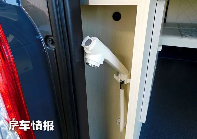 在电路上,这款车搭载了一台350W的逆变器,提供100Ah的副电池,同时车身外部还配备了可充电的接口,可以满足为房车进行补给的需求;水路上则提供看来12L的净水箱和12L的污水箱,基本的用水用电需求还是可以满足的。