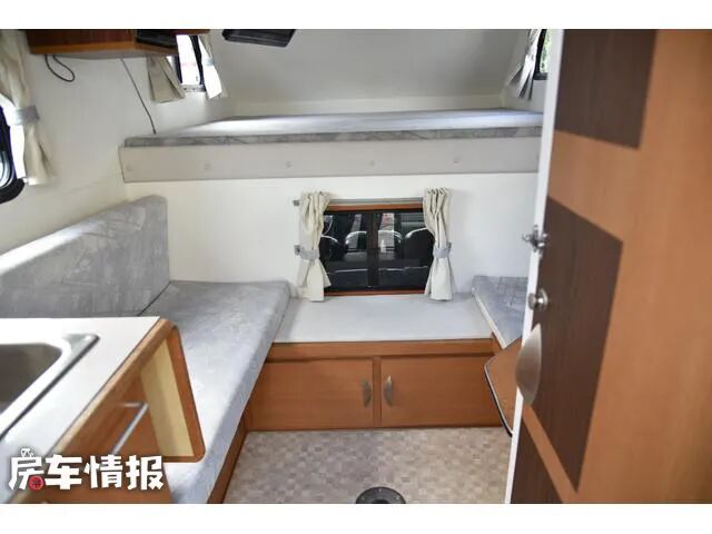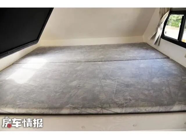 最前方是位于驾驶室上方的额头区域,其中提供了一张双人床,也可以满足两个成年人使用,两侧还带有可通风换气的采光窗户,保证此区域的居住环境。