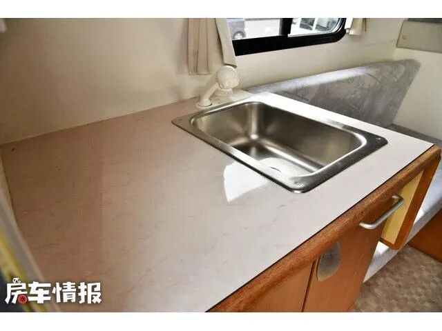 在左侧沙发后方是全车的厨房操作台,带有不锈钢的水槽以及抽拉式的水龙头,后期也可以加装一台卡式炉来满足基础的烹饪需求。