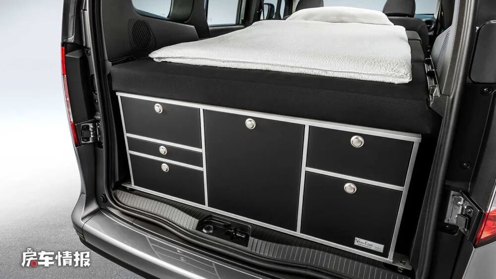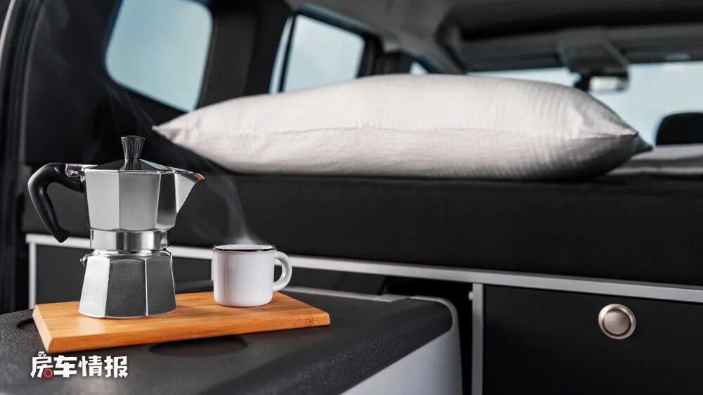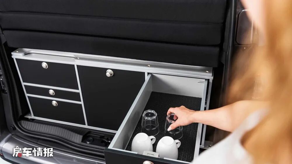 这辆车其实在整体的内部布局上还是保留了原车原貌,最大的改动是在车尾处增加了一个多功能的厨房区域,带有抽拉式的水槽、抽拉燃气灶、31L的车载冰箱以及储物空间,整体的厨用设施不输给标准的房车配备,完全可以满足出行的烹饪需求,而且因为在车尾部,也不必担心油烟会影响车内的问题,整体的造型设计又非常的隐蔽,实用又不占用内部空间。