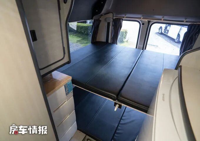 打开后尾门可以看到下铺床板下面还有一些储物空间,也能够存放一些旅行携带的行李。