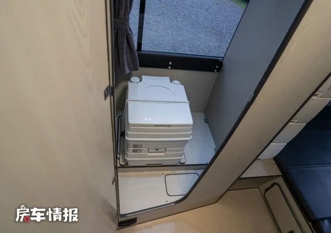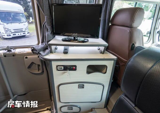 乘客门前方依旧是一贯的鞋柜设计,不过与平时我们常见的方形鞋柜设计不同的是,这款鞋柜还兼具了电视柜的作用,上方配备了一台19英寸的液晶电视,当驻车休息时,也可以看看电视放松一下。