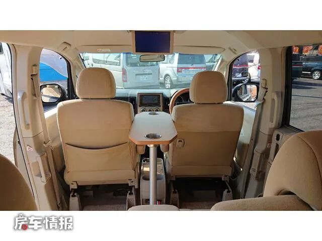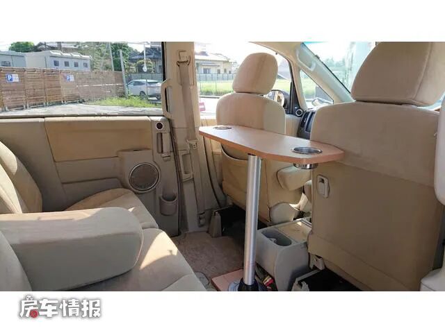 打开后尾门可以进入到车厢尾部,车厢尾部也不是我们常见的日本床车中的设计,而是设计成了一个四人对卡座+小茶几的会客区,平时如果需要接待客人的时候,这个空间肯定是完全够用了。
