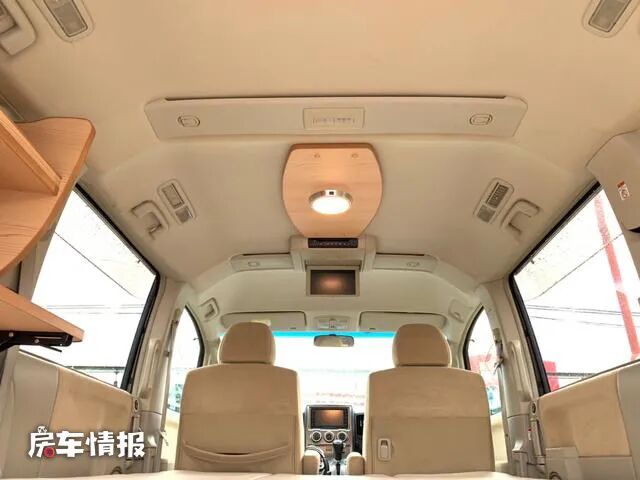 车身左右两侧都可以进入车厢内部,车内采用了米色系的家居,既显干净简洁又非常温馨。