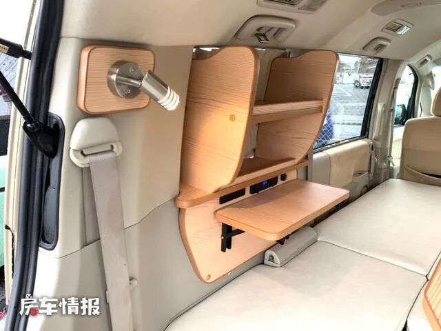 除了带有可以提供睡觉休息的双人床之外,在车厢尾部左侧还提供了带有翻折小桌板的置物架,可以存放一些平时常用的物品,也方便拿取。