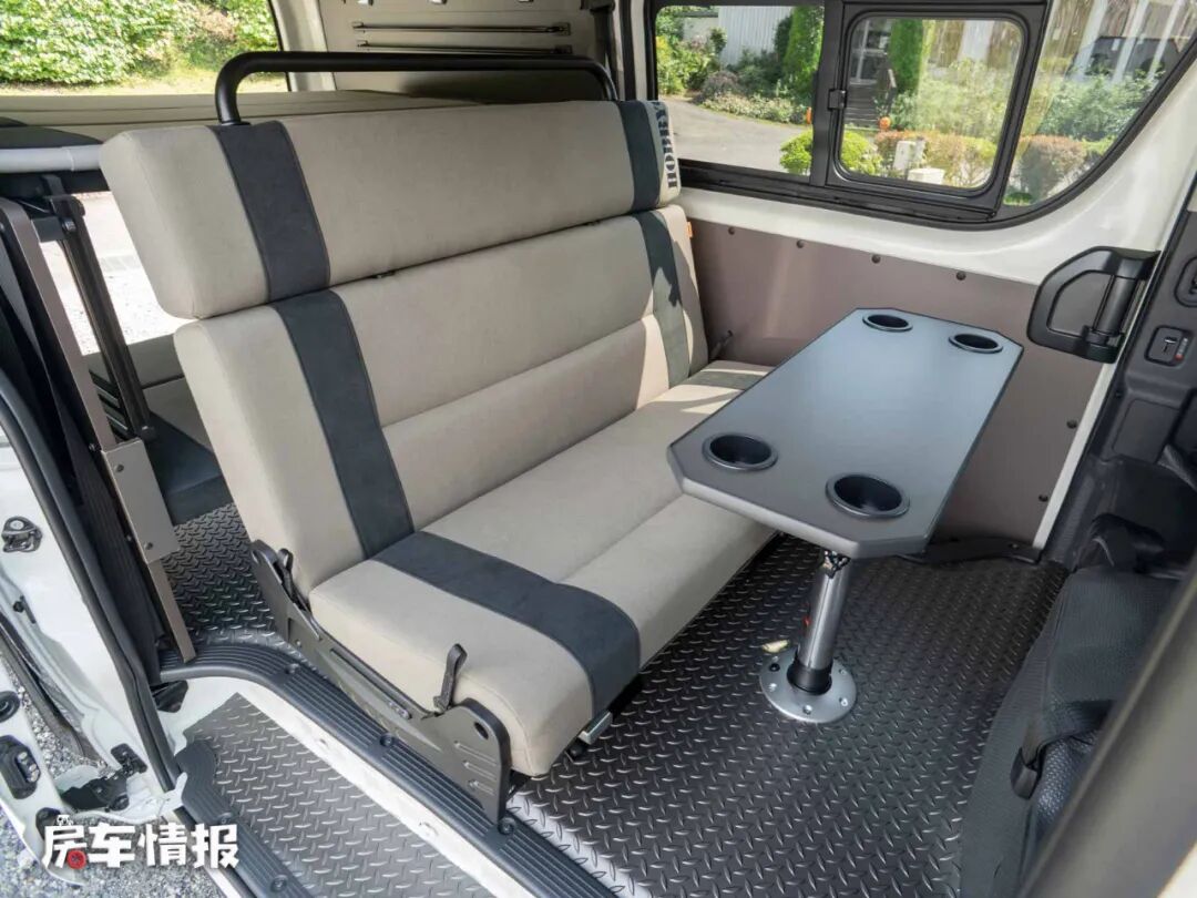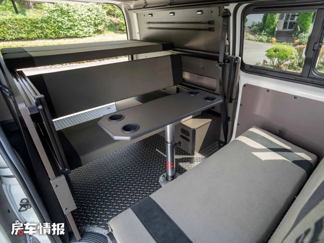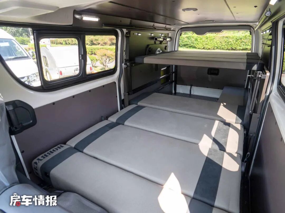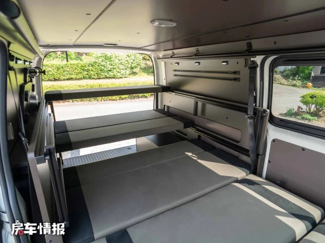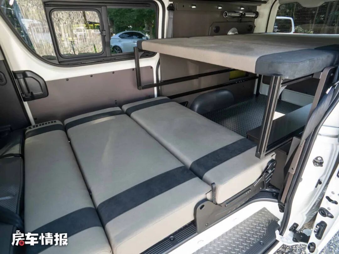 晚上需要睡觉的时候,需要将第三排座椅按照滑轨滑到固定的位置,与后方的床板形成一张小型的双人床,而下方的乘客座椅与下方的床板也可以结合成一张双人沙发床,上下两张床铺,可以容纳一家四口使用。