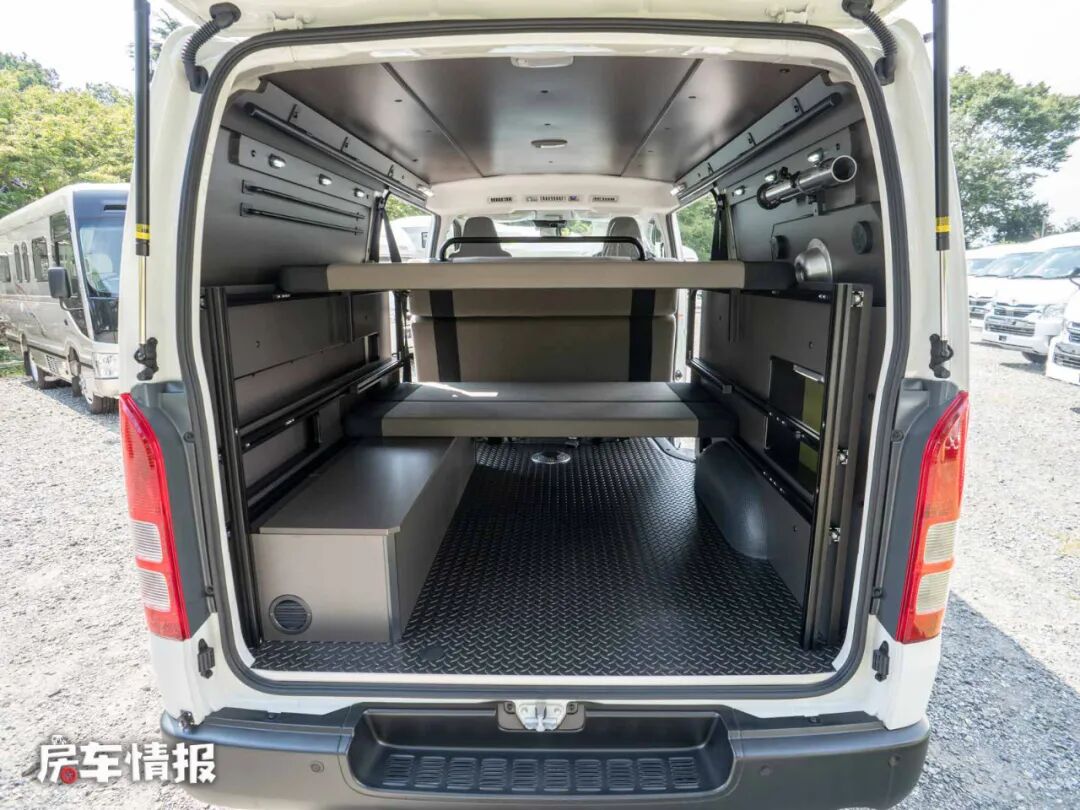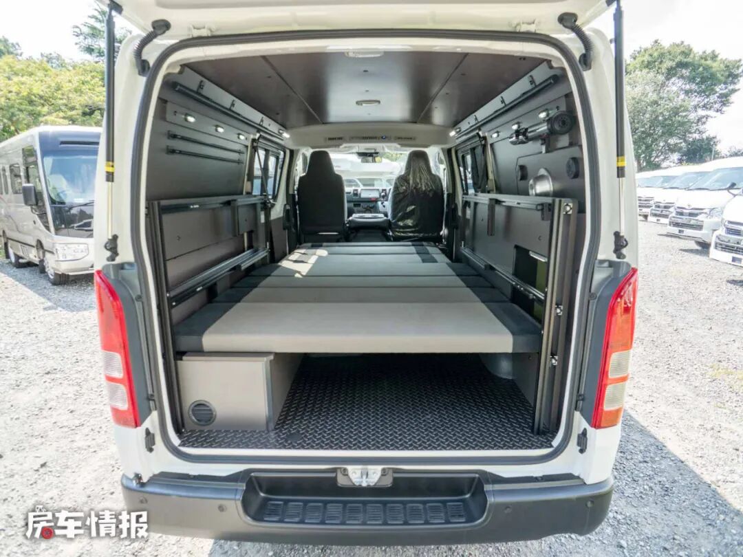 这款床车是基于长轴版的丰田海狮底盘所打造的,全车的长宽高尺寸分别为4695*1695*1980mm,和日本的主流的床车相差无几,也符合当地人的使用习惯。