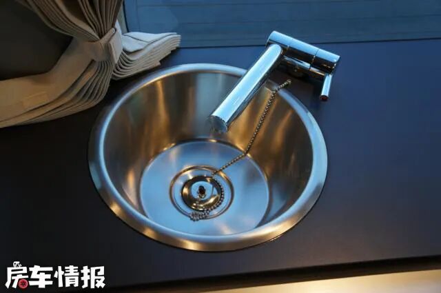 而在车厢尾部的一侧是全车的厨房操作台,台面上带有不锈钢的水盆,结合便携式的电磁炉或者卡式炉,也可以简单的煮个面,满足基本的烹饪需求,下方还有小型的车载冰箱,也可以满足储存食材的需求。