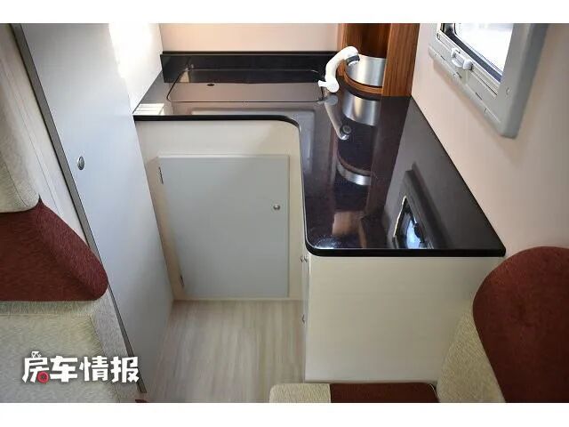 单人座椅后方是全车的厨房区,厨房操作台被打造成了一个L型的吧台式设计,上方带有带盖的不锈钢洗菜池,同时随车配备一台便携式燃气灶,可以满足出行的基本烹饪需求。