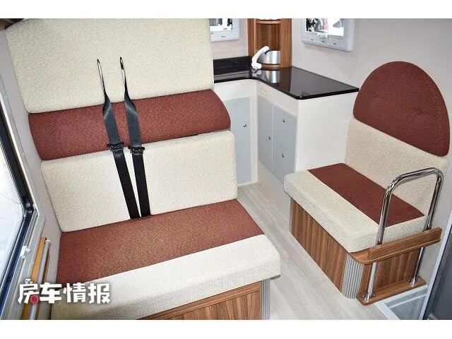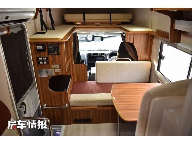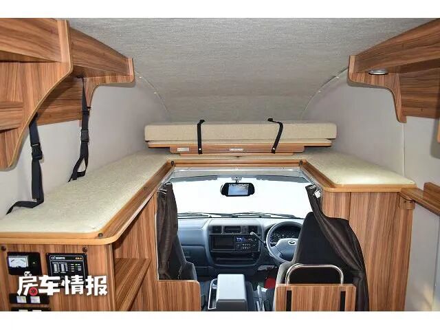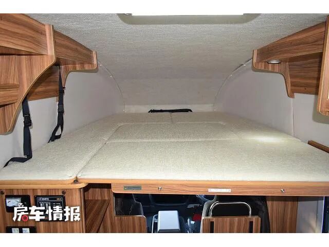 在前方的驾驶室上方的大额头区内提供了一张可折叠的额头床,足够满足两个人的睡眠休息需求,这也是一个很新颖的设计,因为平时不需要的时候还可以将床板折叠起来,这样就能为下方的驾驶室预留出更多的空间,并且可以增加整体的通透性。