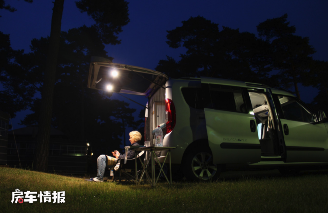 更有意思的是,到了晚上打开后尾门,因为带有两盏照明灯,也可以临时充当户外灯使用,可见整辆车为了一个舒适的露营生活做了非常全面的设计。