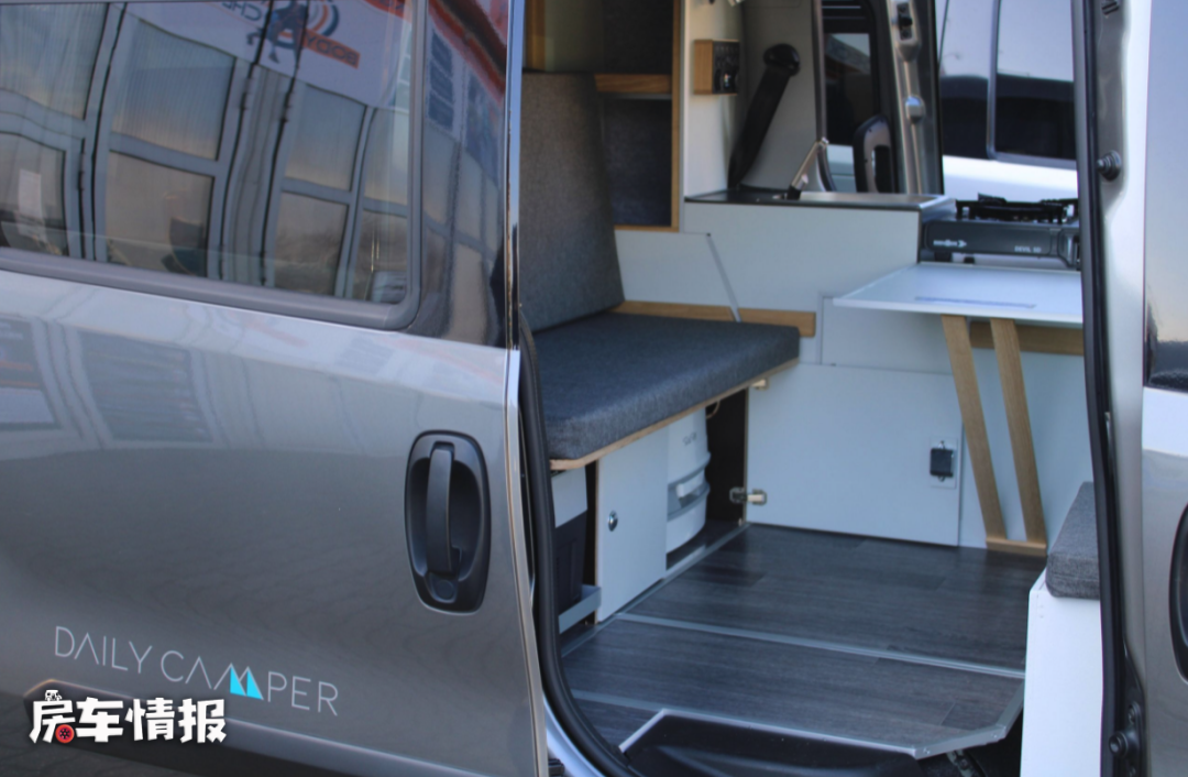 整辆车中为更好的提供露营服务设置了一个厨房区,带有便携式的燃气灶,不锈钢的洗菜池、折叠的小桌板和一台多美达的车载冰箱,整车提供了25L的净水箱,所以基础的用水需求还是可以满足的。