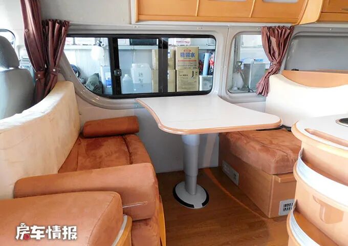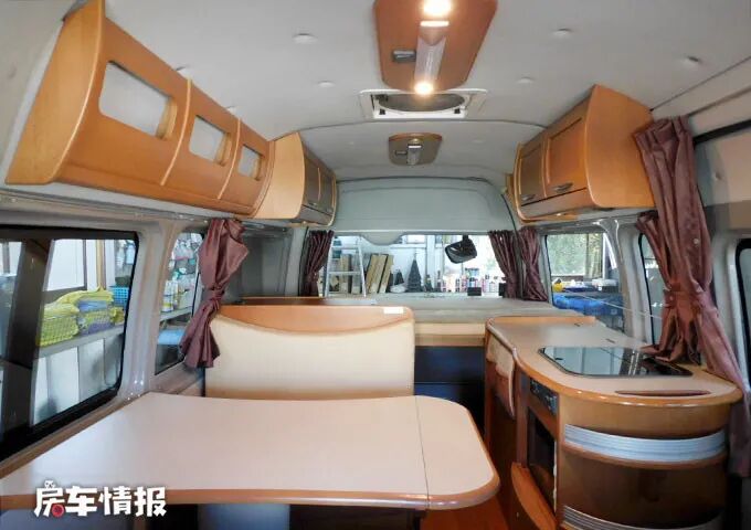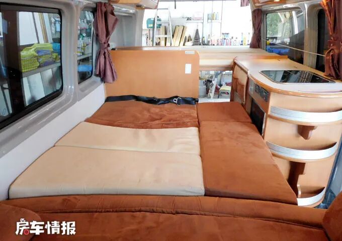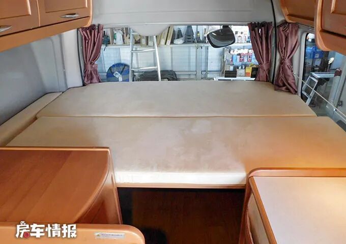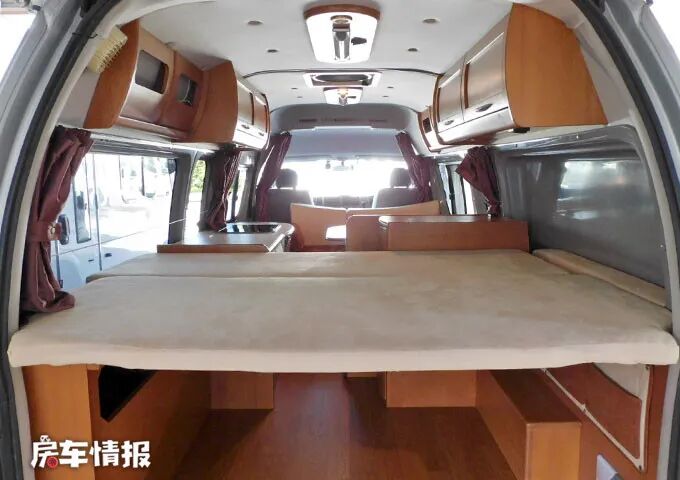 内饰方面,车厢内空间很宽敞,采用木色板面设计,很有家的感觉。由前到后依次为会客区、厨房区以及一张后置大床,能够满足出行时的基本需求。