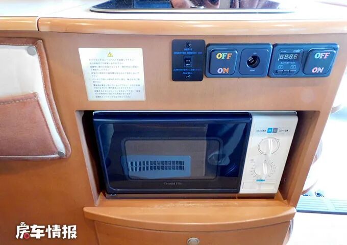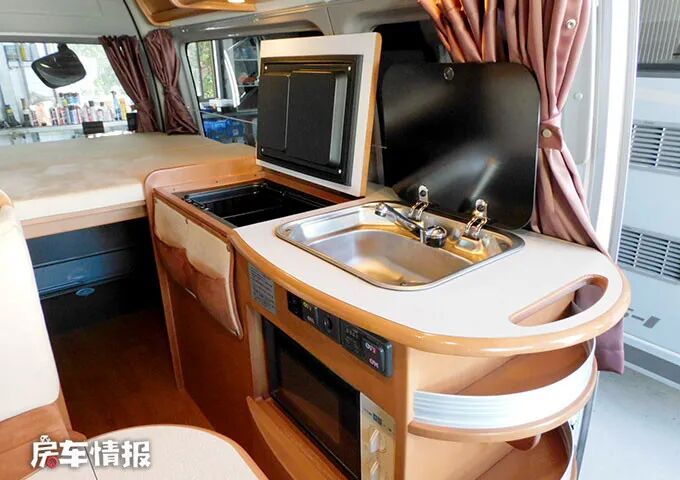 车门右侧是厨房,是一个整体的组合柜,设施非常齐全,装有掀盖式的不锈钢水槽、40L车载冰箱、微波炉以及储物柜,当盖上盖子时,操作台上就会有一个很大的空间,可以切菜、炒菜等,不过需要您携带一个便携式卡炉,这样就能在户外吃到热乎乎的饭菜了,建议您在车外炒菜,因为车内的空间毕竟有限,炒菜的油烟会污染到车内的环境和家具设施,难以清理,车外的遮阳棚可以在烈日或者下小雨时保证有做菜的空间。