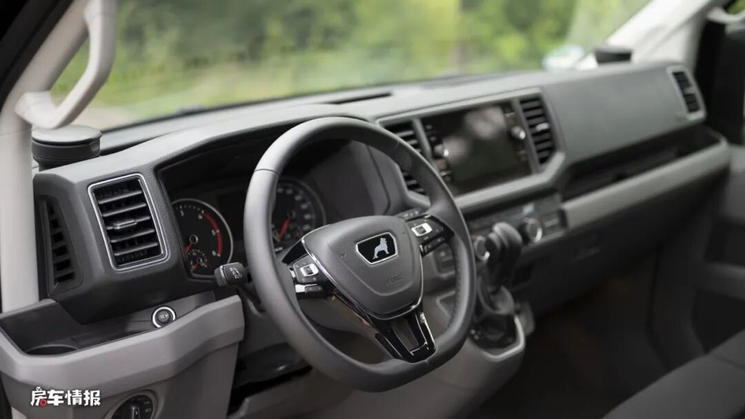 在驾驶室中可以看到整体的设计还是比较简约的,搭配了多功能方向盘以及触控显示大屏,也可以方便驾驶员的后期操控。另外由于这款车和大众Crafter的渊源,为此中控台上也有着浓厚的大众味儿~