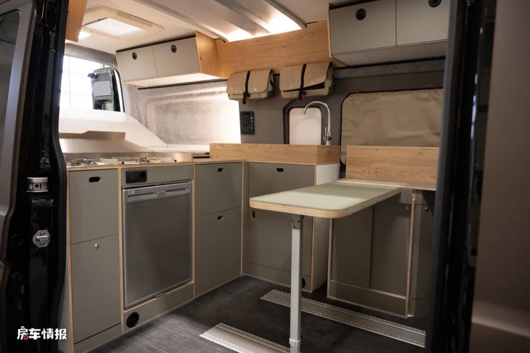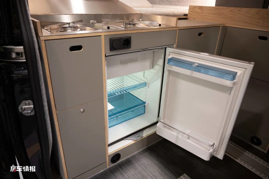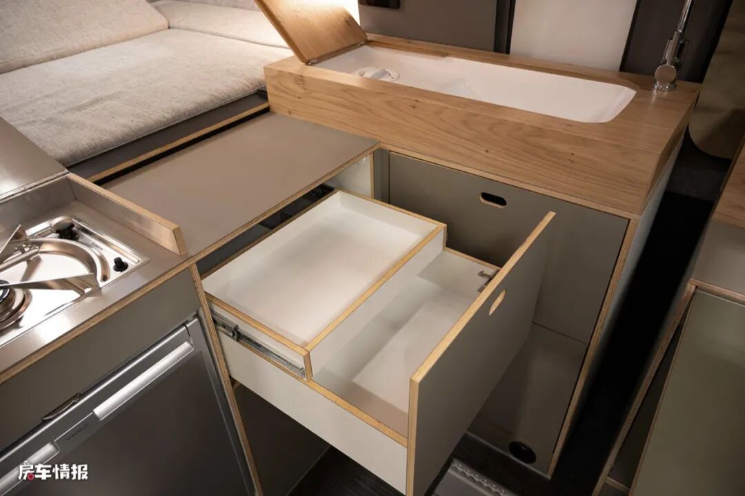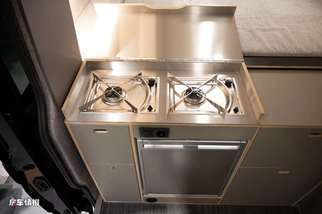 而在乘客门后方的部分,并不是我们常见的纵向厨房操作台,而是一个将前方就餐区与后方休息区分隔而开的横向式橱柜,上面带有两个燃气灶,下方则嵌入了一台80L的车载冰箱,左右都提供了多个储物抽屉,可以存放平时烹饪时所需的用具。