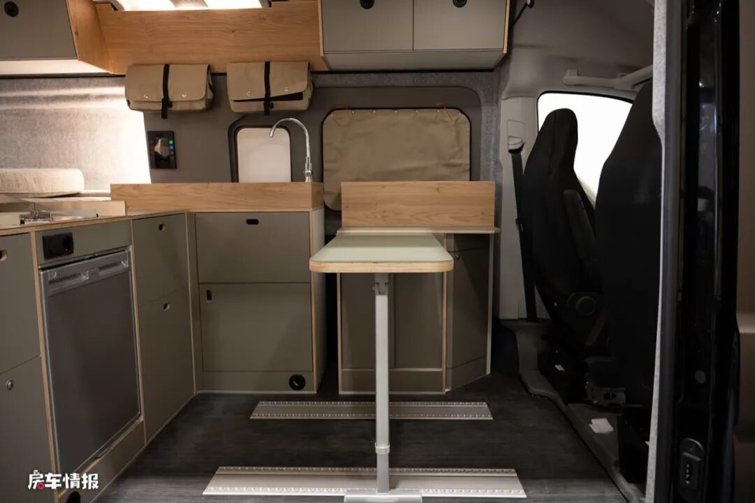 位于驾驶室的后方是一个储物柜,平时需要就餐时,可以加入一台拓展的小桌板,全车没有提供多余的乘客座椅,是因为主副驾驶座椅都带有可向后旋转的功能,这样就能够满足两个人在车内就餐的需求了。