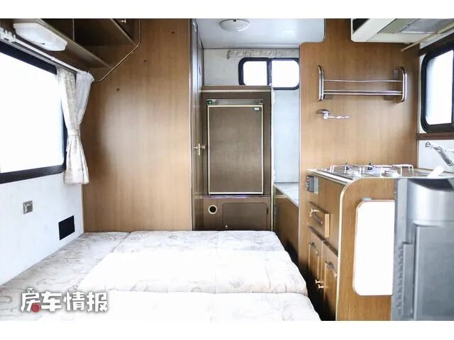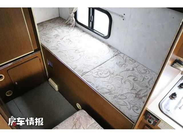 这款房车设计的比较有意思的是,在厨房操作台的后方设计了一个单人的纵置床铺,但是尺寸有限,只有1800*600mm,只能容纳一名成年人使用。