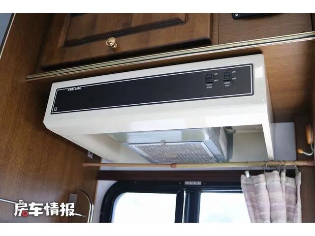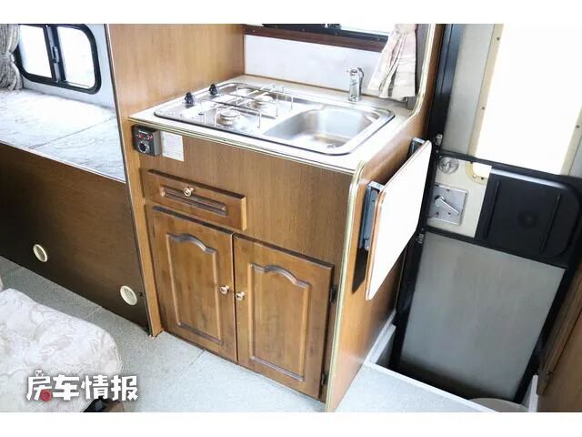 全车的厨房区位于乘客门的后方,尺寸并不是很大,但是在侧面提供了可拓展的桌板,也能够备菜,台面上带有双孔的燃气灶以及不锈钢洗菜盆,上方还提供了一台抽油烟机,能够满足出行的烹饪需求。