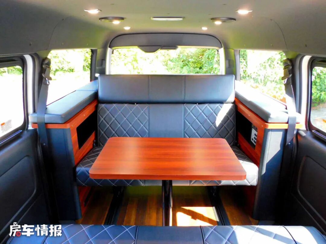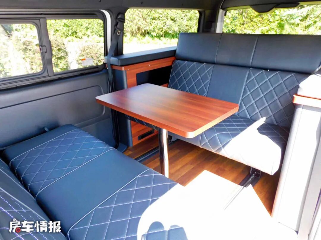 当驻车需要就餐的时候,就可以将第二排乘客座椅向后旋转,与后方的第三排座椅形成一个面对面的交流会客区域,随车还提供了一张大尺寸的可移动木质餐桌,平时完全能够容纳四个人在这里使用。