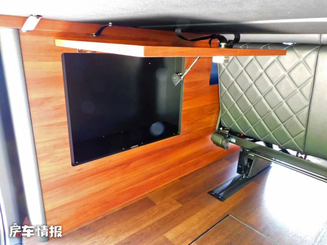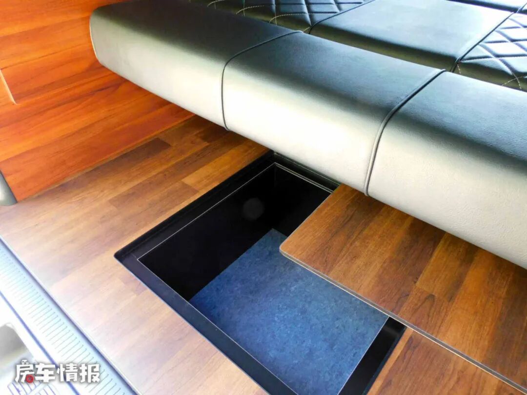 除了这张沙发床,这款车还提供了同款的皮质床垫,车厢尾部两侧带有框架,将床垫铺平在上方,还可以得到一个可以容纳两个小朋友的上铺双人床,所以这辆车平时也很适合一家四口人使用。